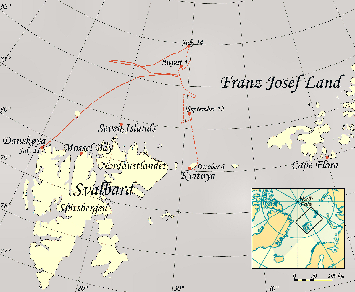 Der Verlauf dieser tragischen Reise wurde später auch verfilmt - Der Flug des Adlers (Ornen schwedisch) - dieser Film wurde auch für den Oscar nominiert. In der geschützten Bucht Virgohamma, im Norden der Insel am Danskegattet, finden sich auch heute noch die Überreste dieses wagemutigen Unterfangens. Dieser Ort ist jedoch eine historische Stätte und darf daher nur mit einer Sondergenehmigung des Sysselmannen betreten werden.